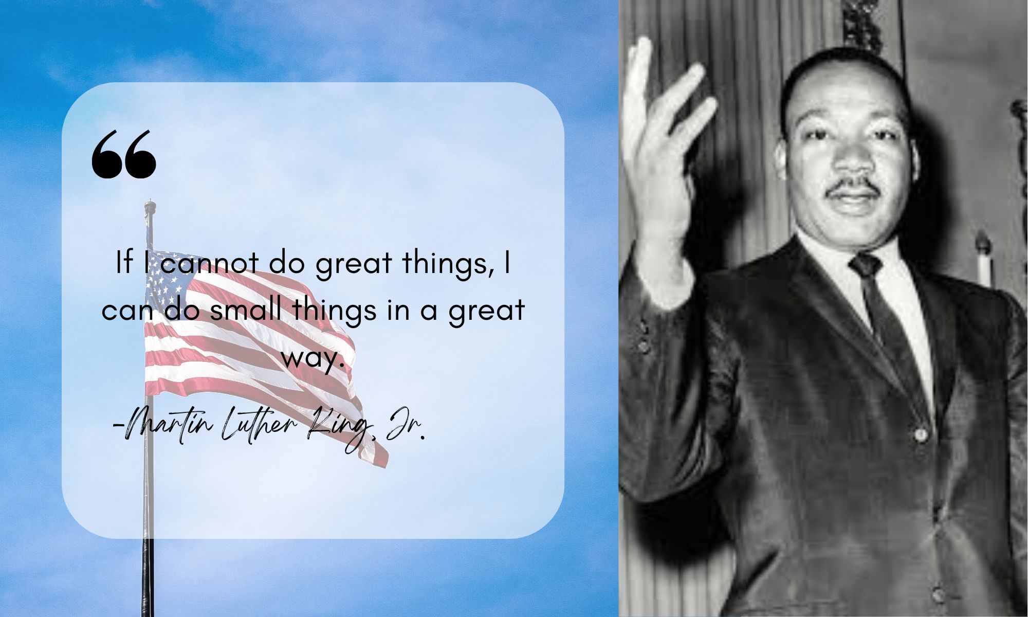 The quote "If I cannot do great things, I can do small things in a great way" is a famous line by Martin Luther King Jr., and it reflects his perspective on the impact we can have on the world, regardless of the size of our actions.