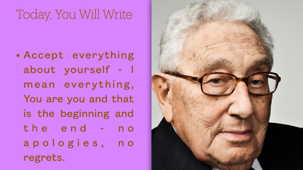 The quote "Accept everything about yourself — I mean everything. You are you, and that is the beginning and the end. No apologies, no regrets" is attributed to Henry Kissinger, a prominent political figure and former U.S. Secretary of State. While it’s not one of his well-documented political statements, the quote reflects a powerful message of self-acceptance and personal authenticity.