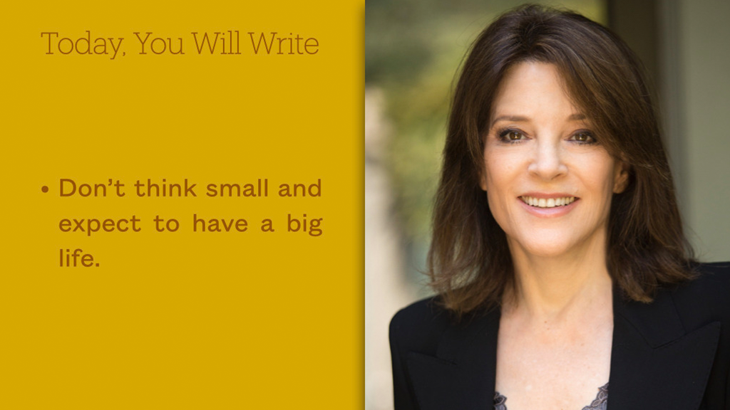 The quote "Don't think small and expect to have a big life" is attributed to Marianne Williamson, a spiritual teacher, author, and speaker known for her motivational and self-empowerment messages.